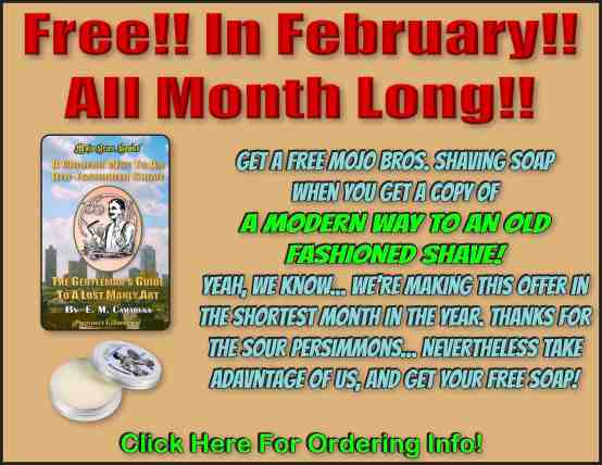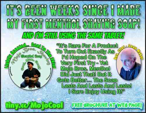 Have I Got An Offer For You! If you are one of the few men who shaves with soap and a brush, look at this! For just $1.25 s/h I will send you a sample of my lush, foamy Mojo Bros. Shaving Soap! I’ve already used it 4 times and it’s still good for more!