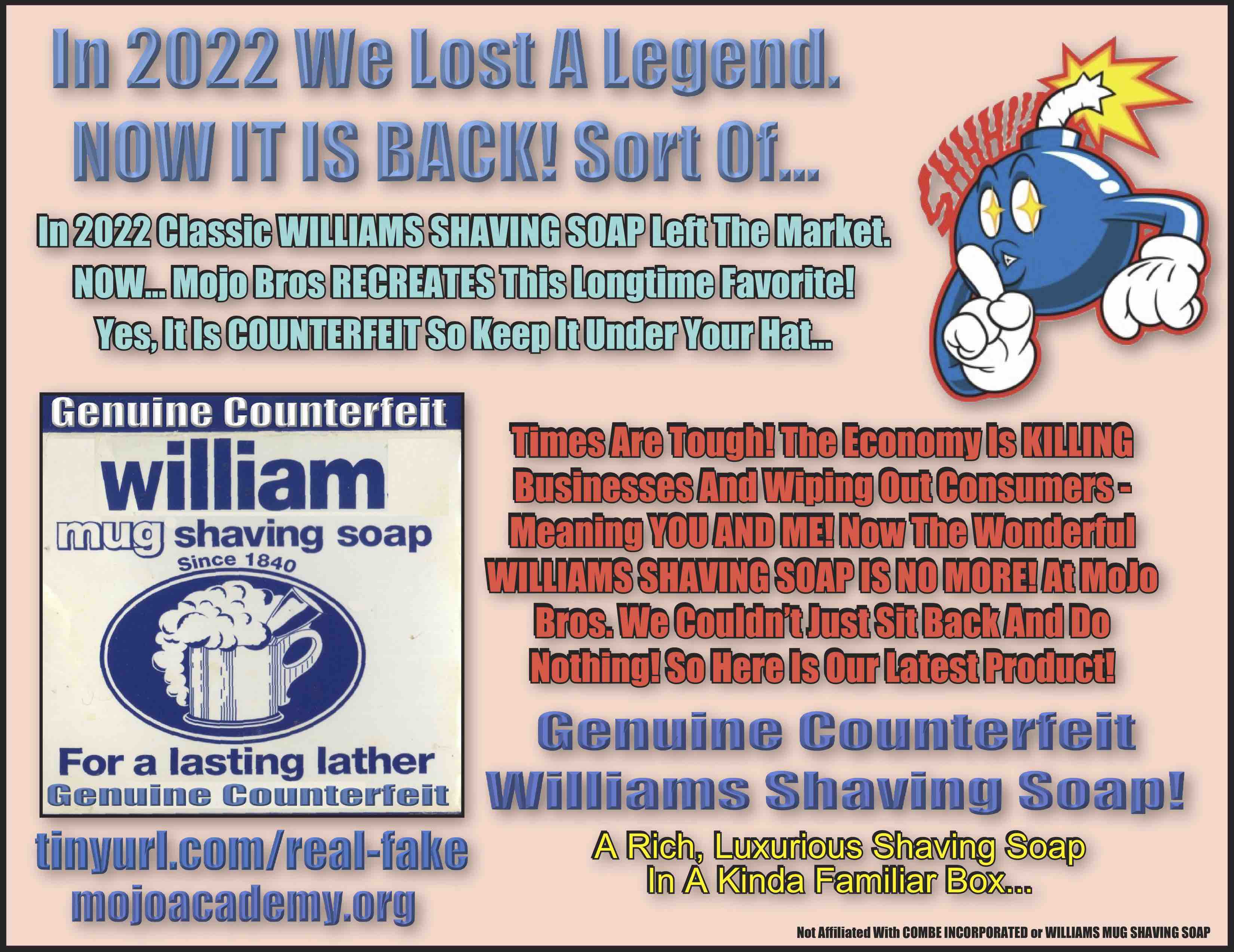 Fortunately, MOJO BROS. SHAVING SOAP had arrived in time to fill the void. But for many of us the loss of WILLIAMS leaves us feeling deserted. WILLIAMS was the first soap of so many shavers! And now, it has gone.